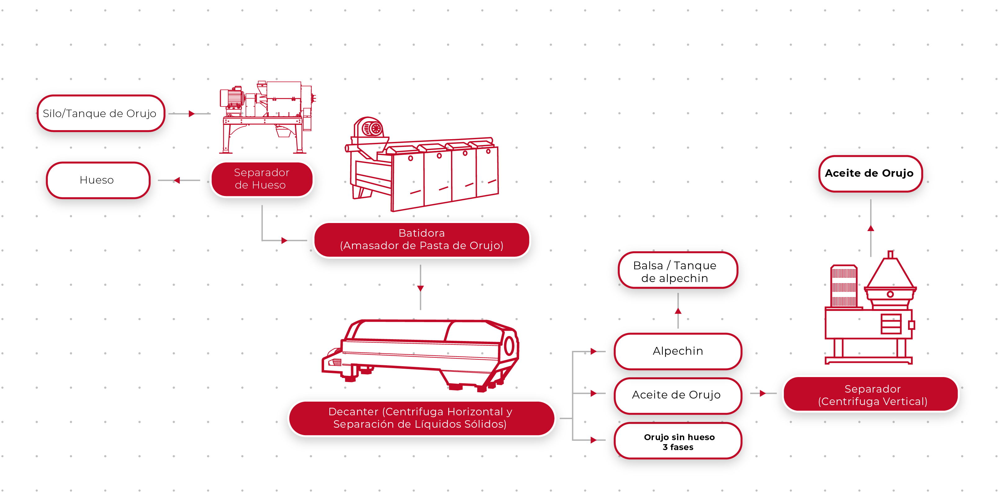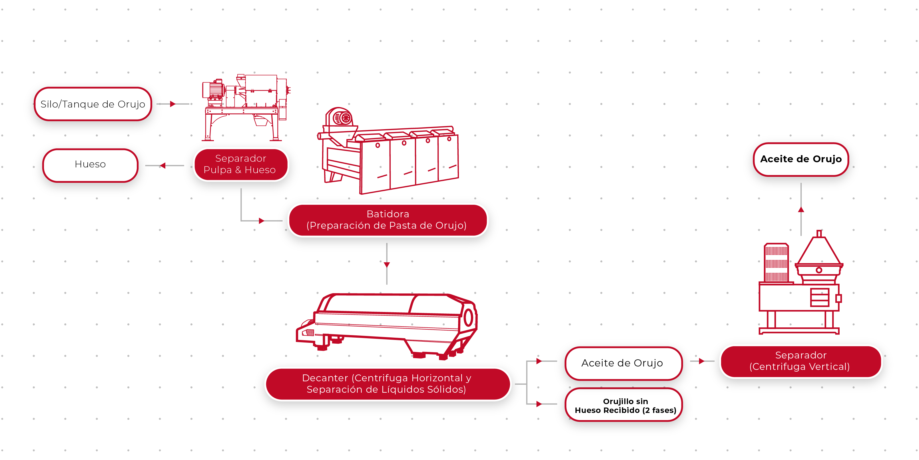 El orujo, recibido de la línea de extracción de aceitunas o del tanque/silo, etc., por medio de la bomba de la estructura pasa primero a través del deshuesadora según la preferencia y en esta etapa se recibe el 60% de los huesos existentes. El propósito de liberar una parte del hueso es aumentar el rendimiento en la extracción. El orujo que se separa del hueso, se lleva a la batidora y se amasa allí durante el período requerido por la pasta y luego se bombea al decantador donde se realizará la separación sólido-líquido. El decantador separa el aceite y el orujo libre de aceite. El aceite de orujo crudo obtenido se transfiere al separador donde se producirá la separación líquido-líquido para eliminar los sedimentos del aceite y cierta cantidad de contenido de agua. Después de este proceso, el aceite se envía a la unidad de filtración o almacenamiento según la preferencia de la operación.