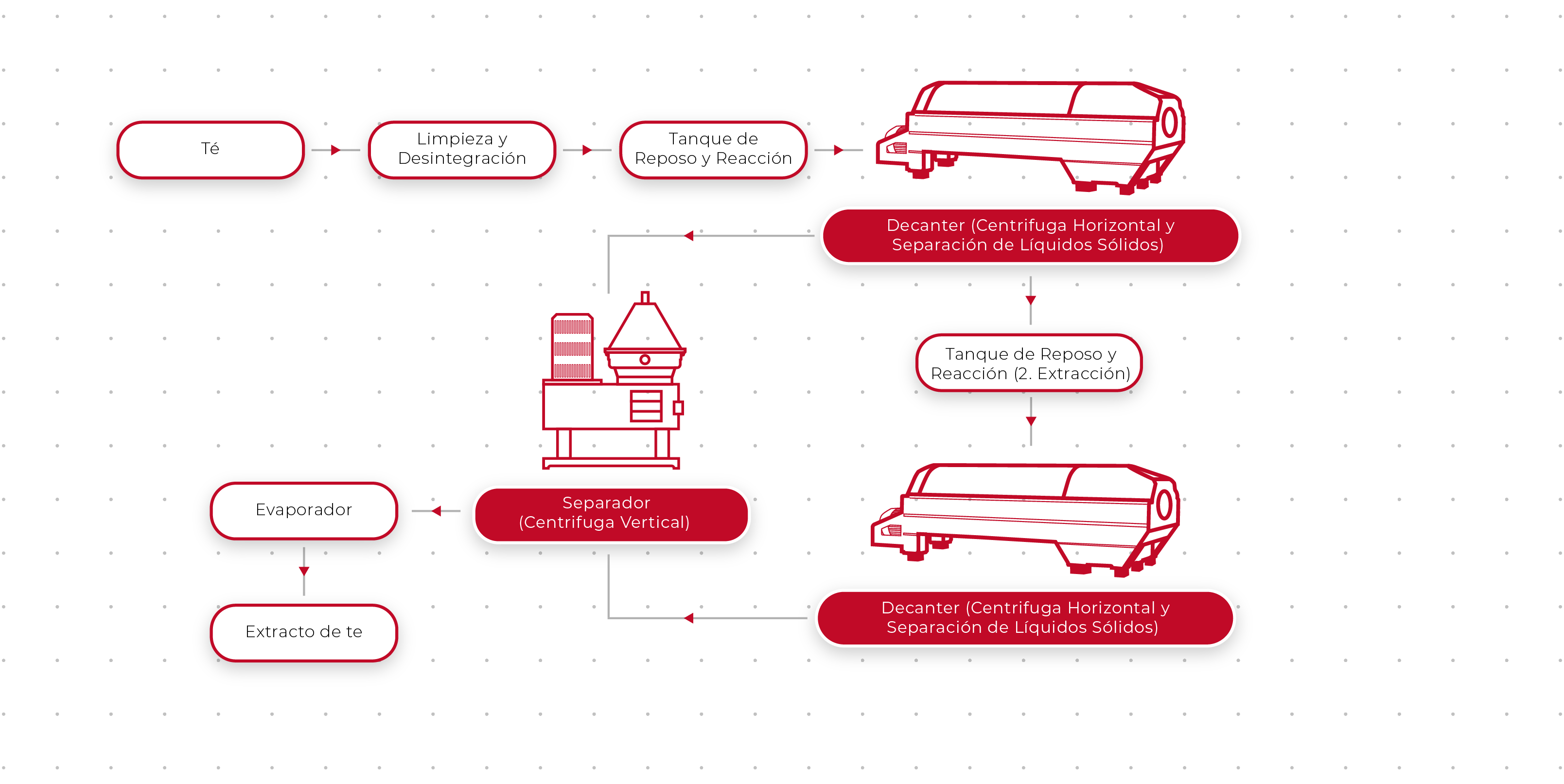 El té, que viene como materia prima, se lleva a los tanques de extracción después de la limpieza y el triturado. La mezcla resultante de agua y té se separa entre sí como extracto de té y sedimento por medio de decantadores de la serie HAUS DDF. Al contener trazas de sedimento en la fase de salida de líquido de la centrífuga decantadora, el extracto de té es alimentado hacia el separador de la serie HAUS FBA para eliminar los sedimentos. El extracto de té, que no contiene residuos, se envía a los secadores después de la evaporación y se pulveriza. Además, la salida de sólidos de la centrífuga decantadora se recircula al sistema de extracción para su recuperación.