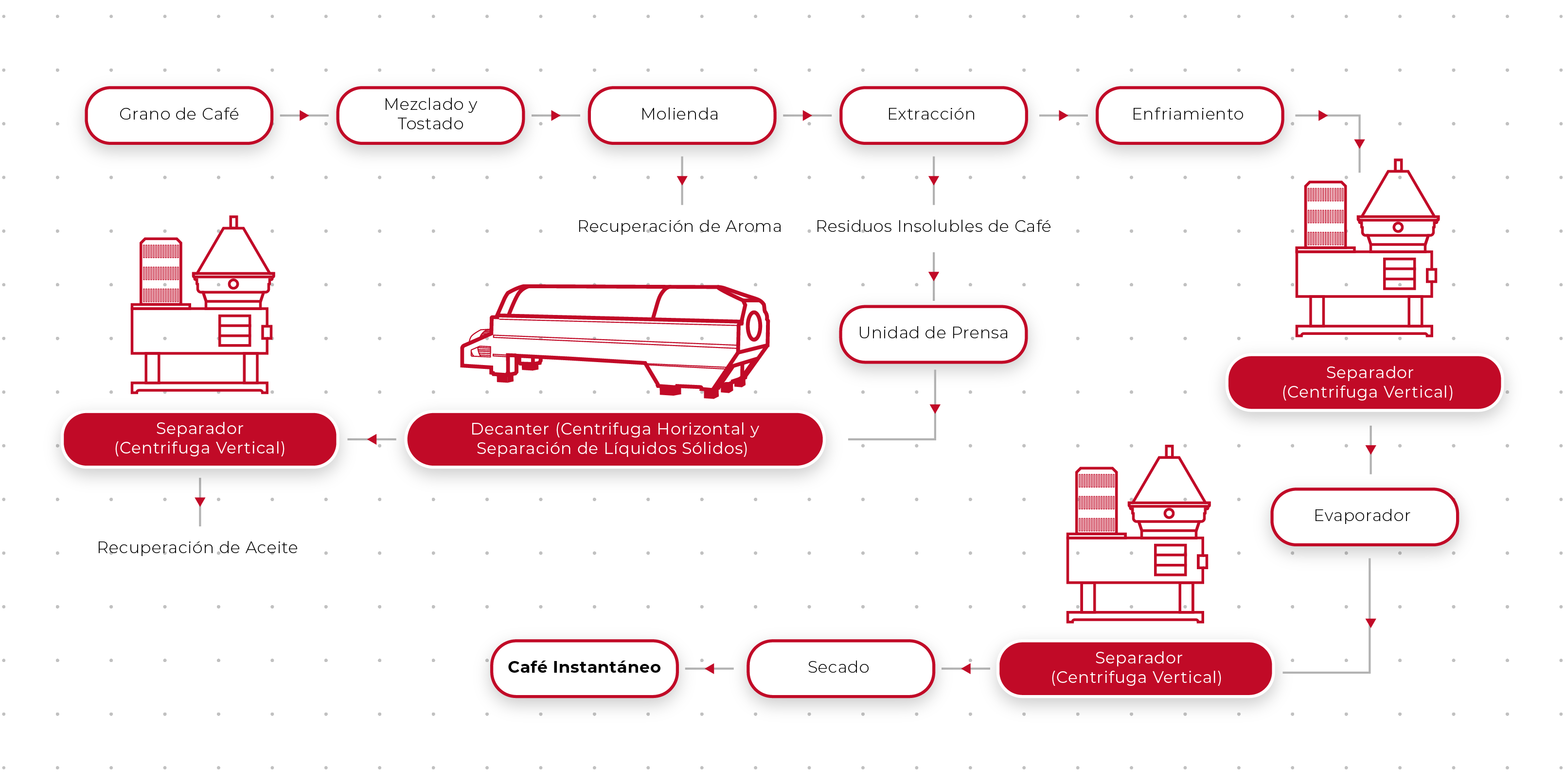 Tras los procesos de mezcla y tostado, los granos de café se muelen y se extrae el producto. El extracto de café obtenido se enfría y luego es alimentado en separadores de la serie HAUS FBA para eliminar el sedimento. El producto se convierte en 'Café instantáneo' después de los procesos de evaporación y secado. Además, los residuos de café no disueltos durante la primera extracción se presionan y se saca el aceite del interior y se recupera el aceite con la ayuda de decantadores y separadores.