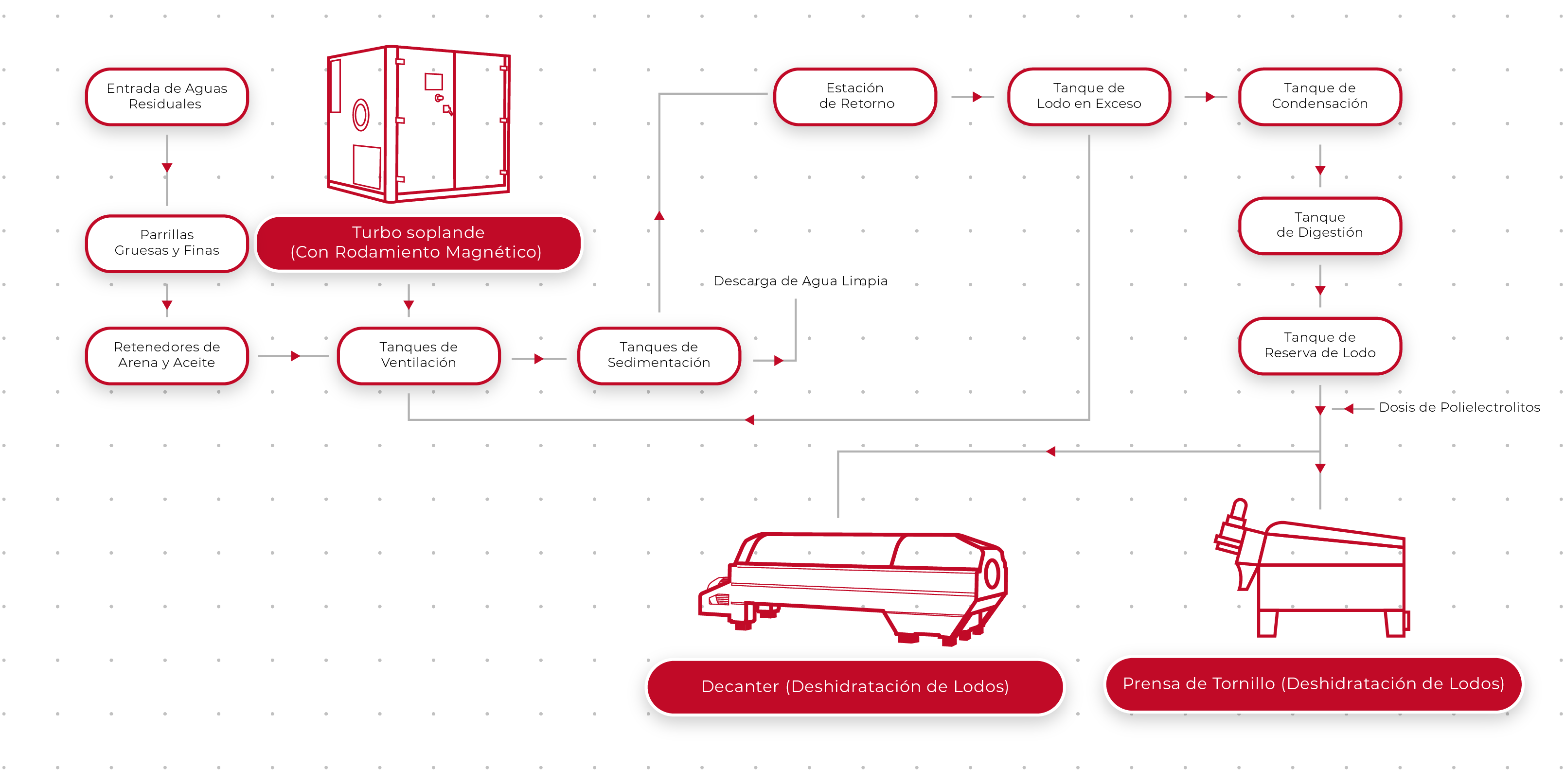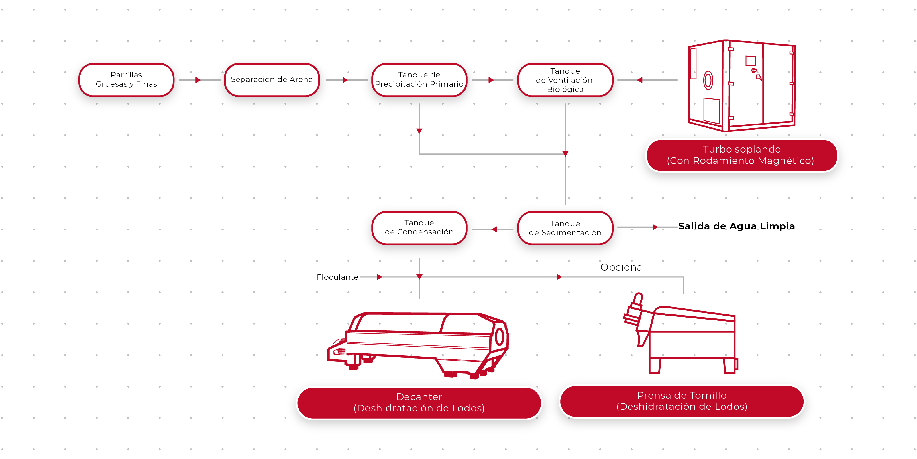 Proceso de Densificación: Se utiliza para aumentar el contenido sólido del lodo con un contenido sólido de aproximadamente 1-3% a 6-8%. El lodo concentrado alimenta al decantador o digestor de desagüe.