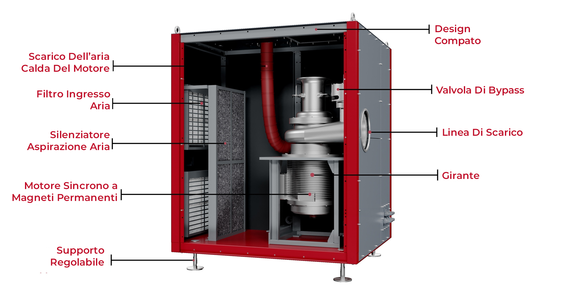 The precise positioning of the impeller allows to reduce the air gap with the casing, and therefore the pressure losses, resulting in a compressor with higher power efficiency.