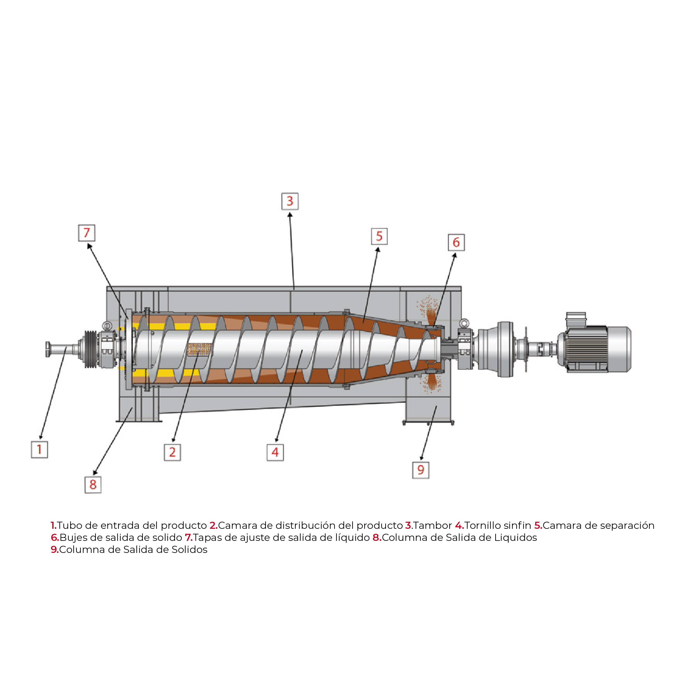 Las centrífugas decantadoras serie DDV consisten en un tambor giratorio horizontal para proporcionar una alta fuerza centrífuga, una espiral que proporciona una descarga continua de la fase sólida separada en el tambor y un sistema de accionamiento de doble motor que proporciona la transferencia de potencia diferencial deseada al sinfín con este tambor. Puede tener una configuración de 2 o 3 fases.