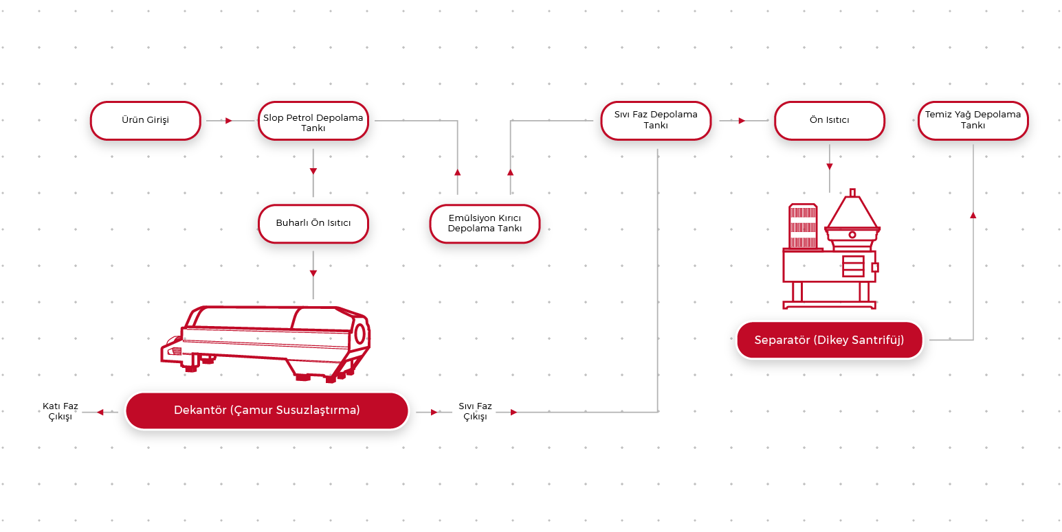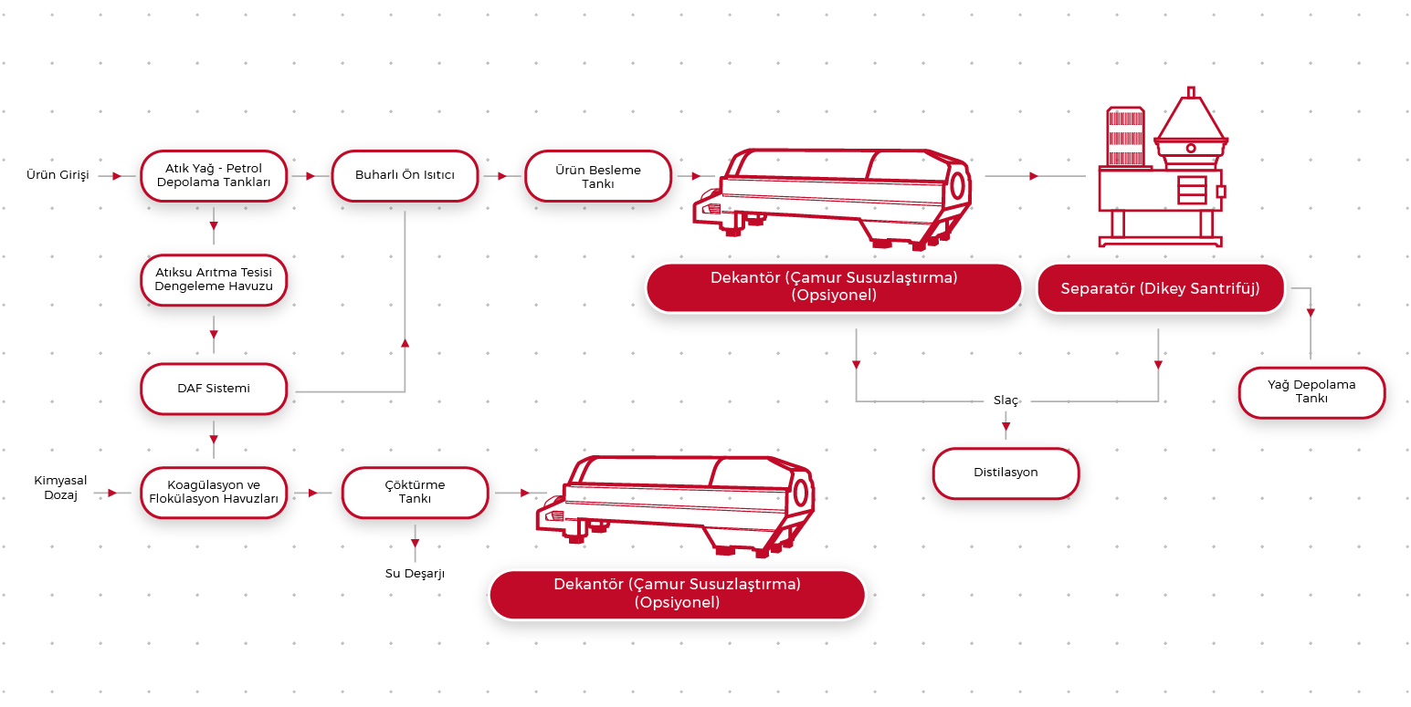 Belirli bekleme süresinde 50-70°C'ye kadar ısıtılır. Atıktan fiziksel olarak ayrılan serbest su bekleme aşamasında alınır. Atık depolama tanklarında serbest su alındıktan sonra su-yağ karışımı pompa vasıtasıyla dekantöre beslenir. Dekantör ile katı fazın ayrılması sağlanır. Ardından katısından ayrılmış ürün 85-90°C'ye kadar ısıtılarak separatöre beslenir. Separatör vasıtasıyla yağ fazın geri kazanımı sağlanır ve çıkış su fazı arıtma tesisine gönderilmektedir. Önceki kademede ayrılmış olan katı faz, bertaraf tesislerine veya yüksek kalorifik içeriği nedeniyle yakmaya gönderilmektedir.